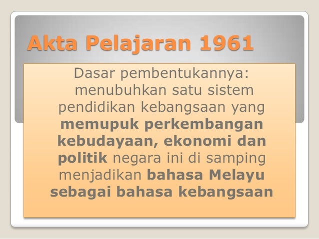 Akta Pendidikan 1961 from image.slidesharecdn.com Melicinkan tatacara pengurusan pelajaran meningkatkan mutu pelajaran keseluruhan. Perbezaan akta pendidikan 1961 dan akta pendidikan 1996. Pelajaran di sekolah rendah adalah percuma 2. Kesemua akta ini mahu mendaulatkan bahasa melayu (juga bahasa inggeris) sebagai bahasa pengantar. Sekolah rendah menjadi sekolah kebangsaan dan jenis kebangsaan. Akta pendidikan pendidikan 1996 adalah merupakan lanjutan dan pembaharuan dari akta pelajaran 1961. Martlamat utama perlaksanaan dasar ini ialah bagi menjamin satu sistem pendidikan yang mengutamakan bahasa kebangsaan sebagai bahasa pengantar di semua peringkat pendidikan. Laporan rahman talib (1960) /akta pelajaran 1961 di antara beberapa perubahan dan pindaan yang dibuat dari laporan razak yang dikenali dengan laporan rahman talib ialah: