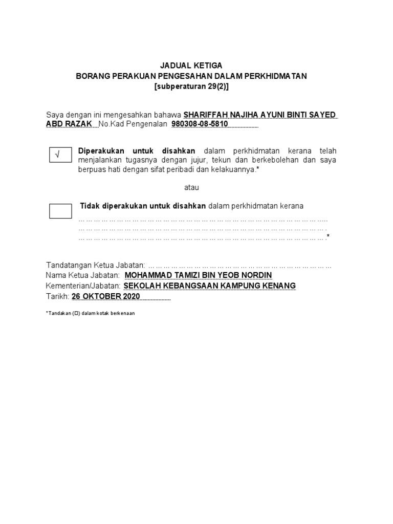 Jadual kelima borang opsyen kwsp. Kad pengenalan … … telah menjalankan tugasnya dengan jujur, tekun dan berkebolehan dan saya berpuas hati dengan sifat peribadi dan kelakuannya. Secara umumnya, pemilihan opsyen bagi skim kwsp hendaklah dilaksanakan sebelum pegawai diperakukan pengesahan dalam perkhidmatan. Borang perakuan pengesahan dalam perkhidmatan subperaturan 29(2). Syarat pengesahan yang ditetapkan subperaturan 31(1).